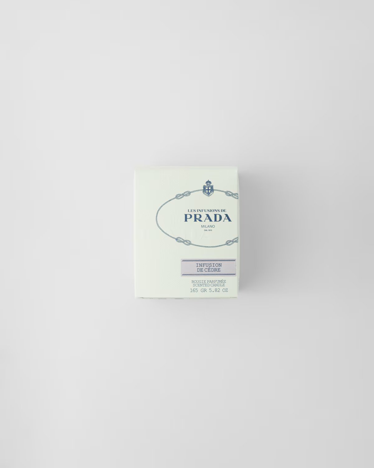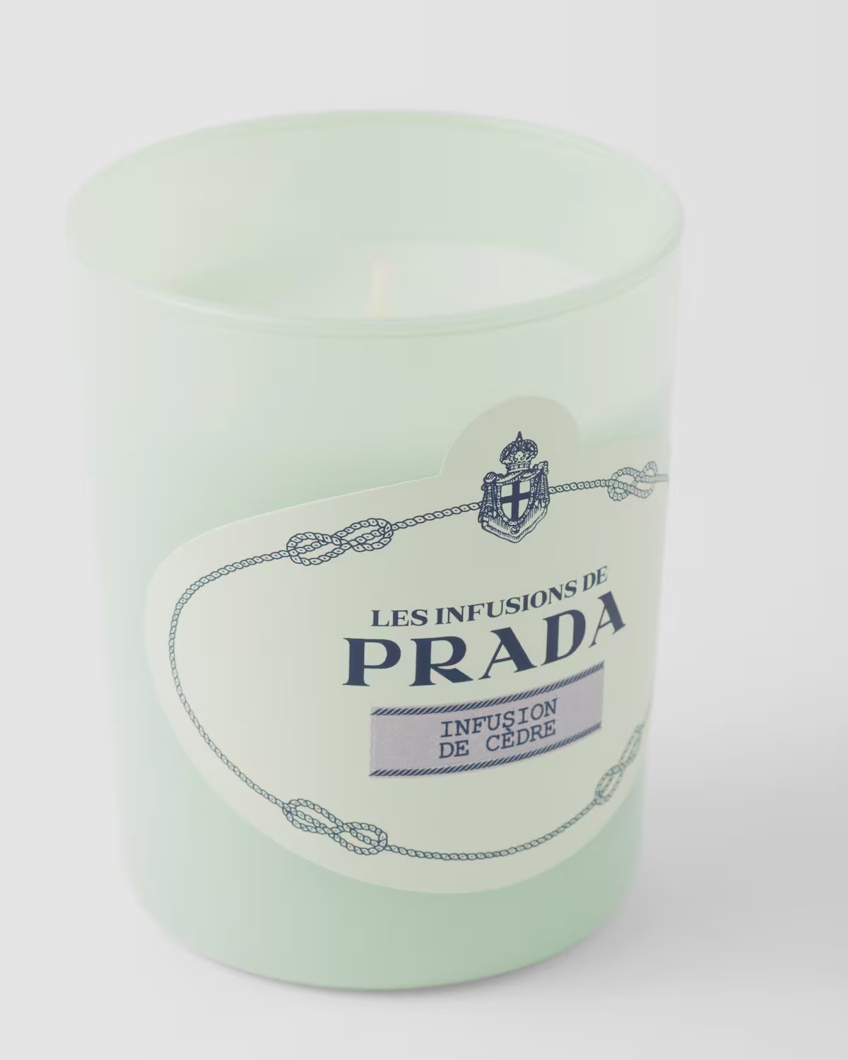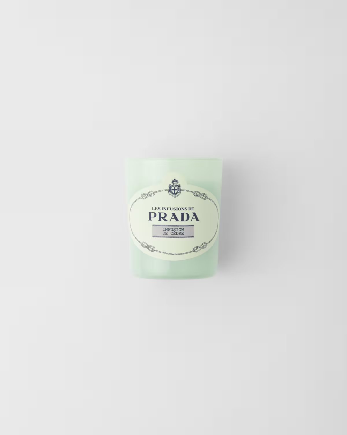 Clean and magnetic, Infusion de Cèdre candle expresses new facets of a powerful cedarwood mixed with an unexpected twist of mandarin. The base is magnified by enigmatic incense and benzoin accords. —Infusion de Cèdre candle encapsulates all the Prada codes within an elegant Prada green opaline glass signed by a Saffiano embossed label in the shape of the historical logo. This luxurious object brings home the sophisticated spirit of Prada.