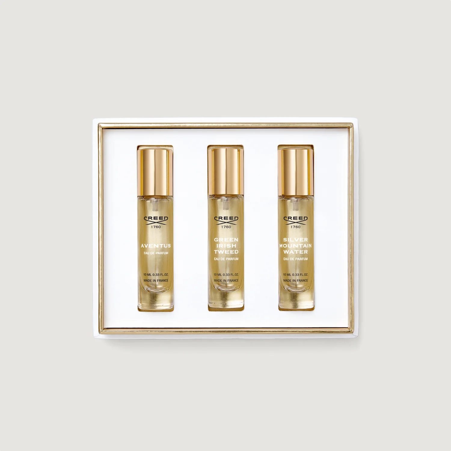 An exclusive 3-piece gift set featuring Aventus, Green Irish Tweed & Silver Mountain Water.